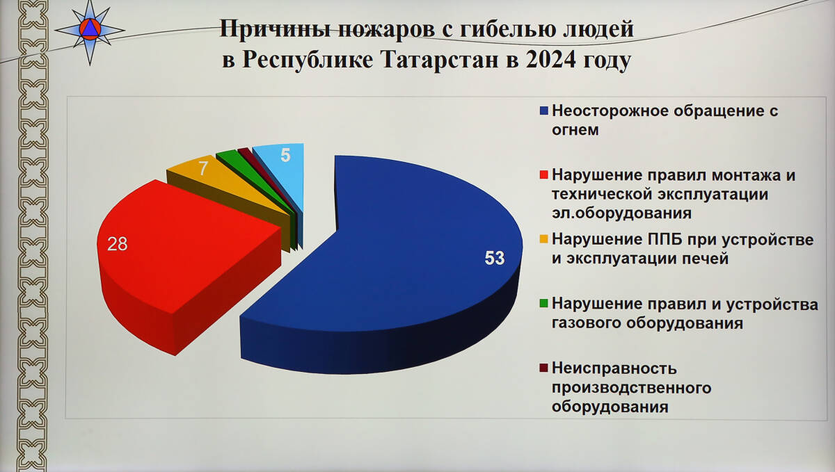 Тем не менее сам 2024 год вышел менее пожароопасным, чем предыдущий 2023-й. Количество пожаров уменьшилось на 14,7% – 3820 случаев против 4476 прошлогодних. С начала года в пожарах на территории Татарстана погибли 96 человек, это на 24 человека меньше, чем в прошлом году.
