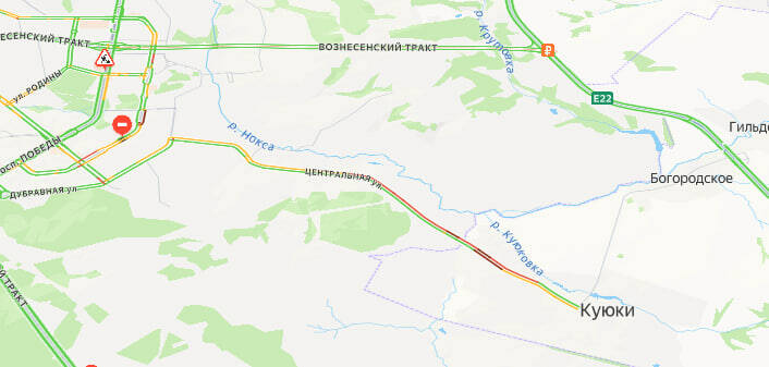 Движение на карте местами отображается не просто красным цветом, а темно-бордовым, что свидетельствует о сильном его затруднении.