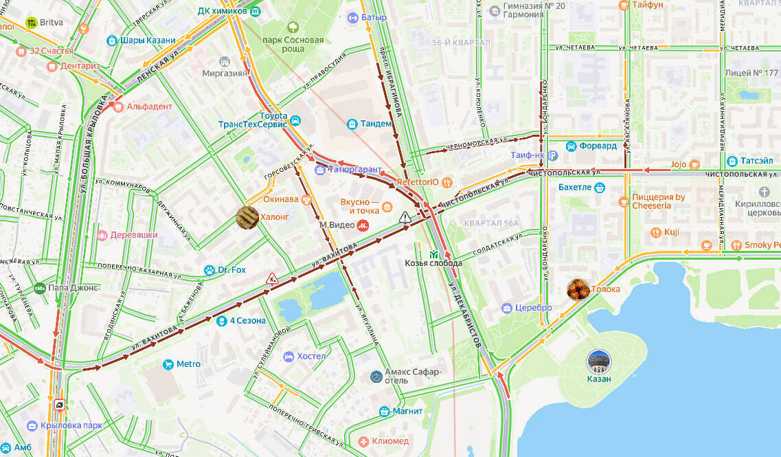 Серьезная пробка образовалась на перекрестке улиц Декабристов и Чистопольской в Казани. Согласно данным сервиса «Яндекс.Карты», движение сильно затруднено.