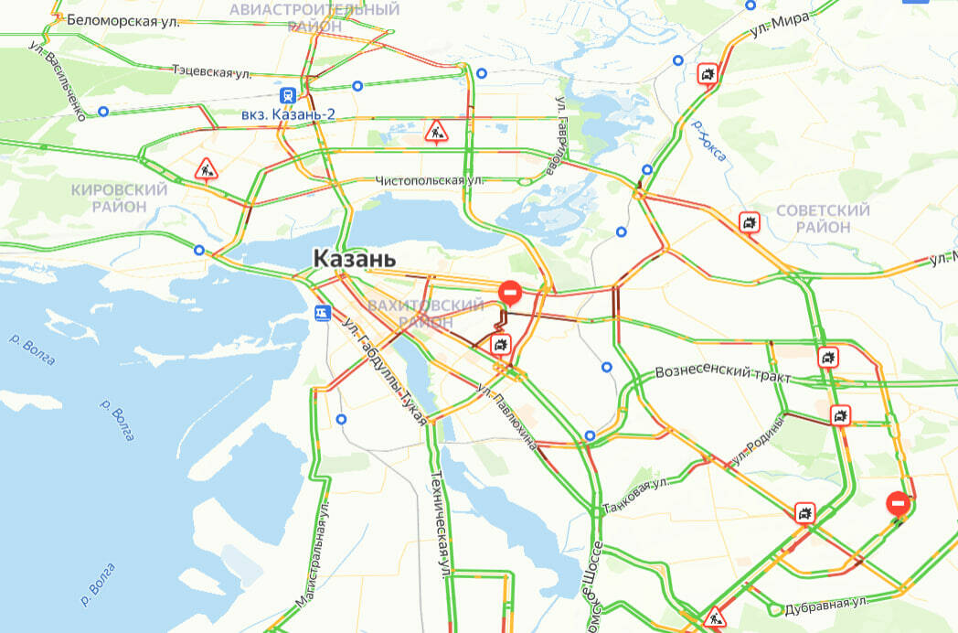 Движение на центральных улицах города замедлилось до минимума, крупные заторы также образовались на проспекте Победы, Ямашева, улице Рихарда Зорге.