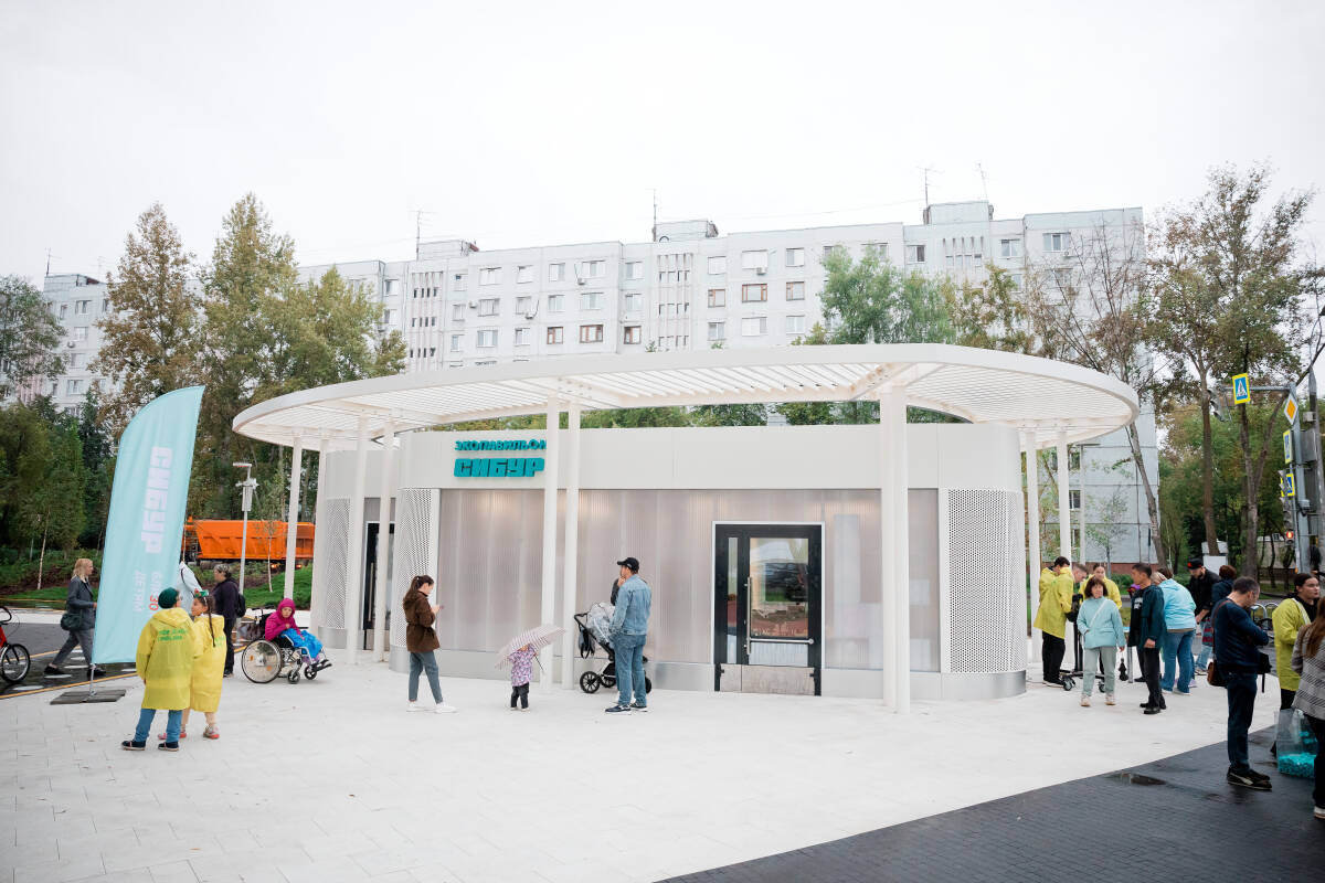 Центральный элемент территории – инновационный экопавильон с фасадом из замковых поликарбонатных панелей «Сафпласт», произведенных в Казани из полимеров «Казаньоргсинтеза» (СИБУР – единственный производитель такого пластика в России и СНГ). Часть мебели сделана из вторичного переработанного пластика.