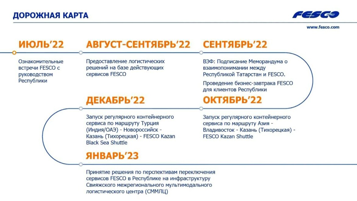 Он предложил в сентябре подписать меморандум между руководством компании и республики. «Чтобы в октябре 2022 года выйти на запуск регулярного контейнерного сервиса по маршруту Юго-Восточная Азия – Владивосток – Казань, станция Тихорецкая. В декабре запуск сервиса по маршруту Турция, Индия или ОАЭ – Новороссийск – Казань. В январе 2023 года переключить сервисы FESCO в Татарстане на инфраструктуру Свияжского межрегионального мультимодального логистического центра (СММЛЦ)», – рассказал о перспективах Кравченко.