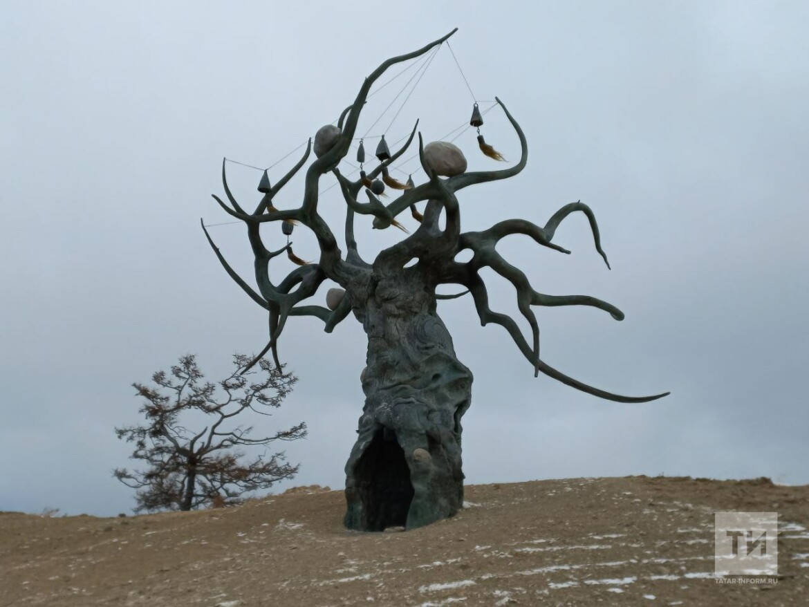 Скульптура Хранителя Байкала имеет форму дерева с дуплом и возвышается на восточном берегу острова Ольхон