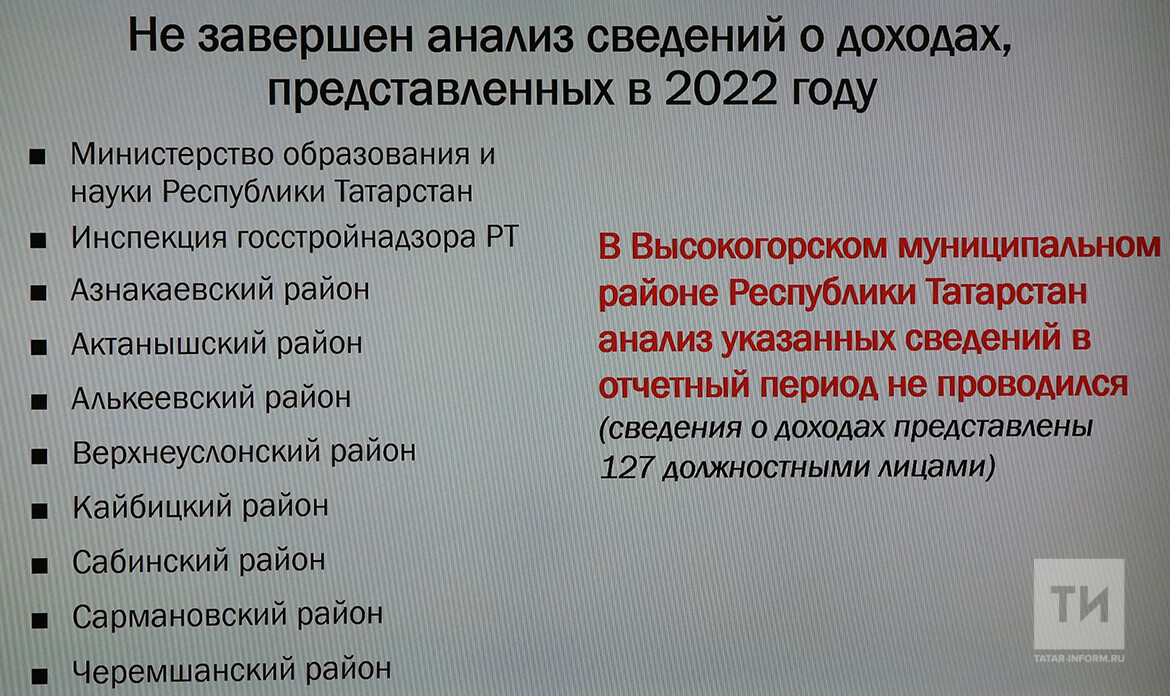 В числе аутсайдеров по анализам сведений о доходах муниципальных служащих так же оказались Лаишевский, Ютазинский и Сабинский районы. За весь год они в общей сложности успели проверить 31 человека, в то время как другие районы успели проанализировать более трехсот. Среди органов государственной власти с низкими показателями анализов сведений о доходах оказались Минкульт РТ, Агентство инвестиционного развития и Госкомитет РТ по закупкам.