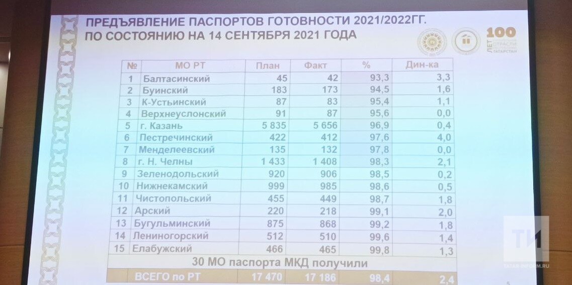 Из имеющихся в Татарстане 17 470 многоквартирных домов (МКД) 17186, или 98,4%, имеют паспорта готовности к предстоящему отопительному сезону. Все МКД готовы к осенне-зимнему сезону в 30 муниципалитетах республики из 45, рассказал представителям СМИ первый заместитель министра строительства, архитектуры и жилищно-коммунального хозяйства РТ Алексей Фролов.