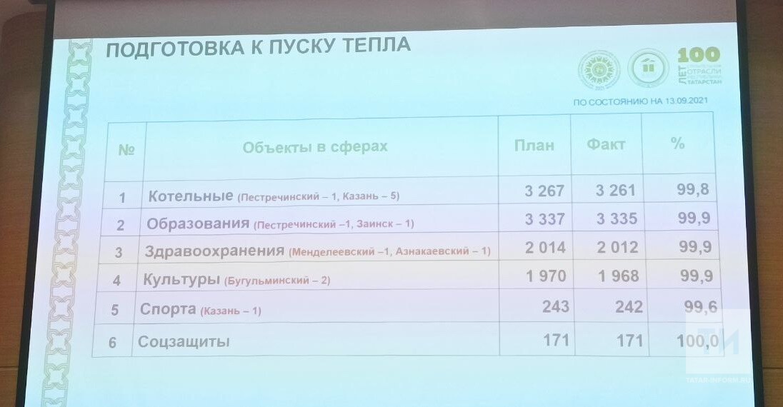 О готовности к пуску тепла свидетельствуют различные данные. Из 3267 котельных лишь в шести пока не выполнены все виды запланированных работ. Объекты здравоохранения, образования, культуры на 99,9% готовы к зимним холодам. Один спортивный объект из 243 (он находится в Казани) в эти дни завершает работы по подготовке к зиме, а объекты социальной защиты уже готовы на все 100%.