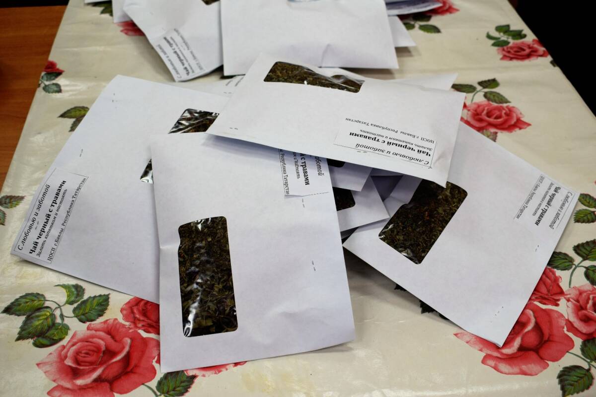 Чай расфасовывают в специальные конверты, подписанные «С любовью и заботой», здесь же указана инструкция, как заваривать напиток. В его составе разные травы, собранные волонтерами весной и летом: зверобой, душица, мелисса, мята, листья малины, смородины, шиповник. Такой чай согревает в холодную погоду и хорошо укрепляет иммунитет.