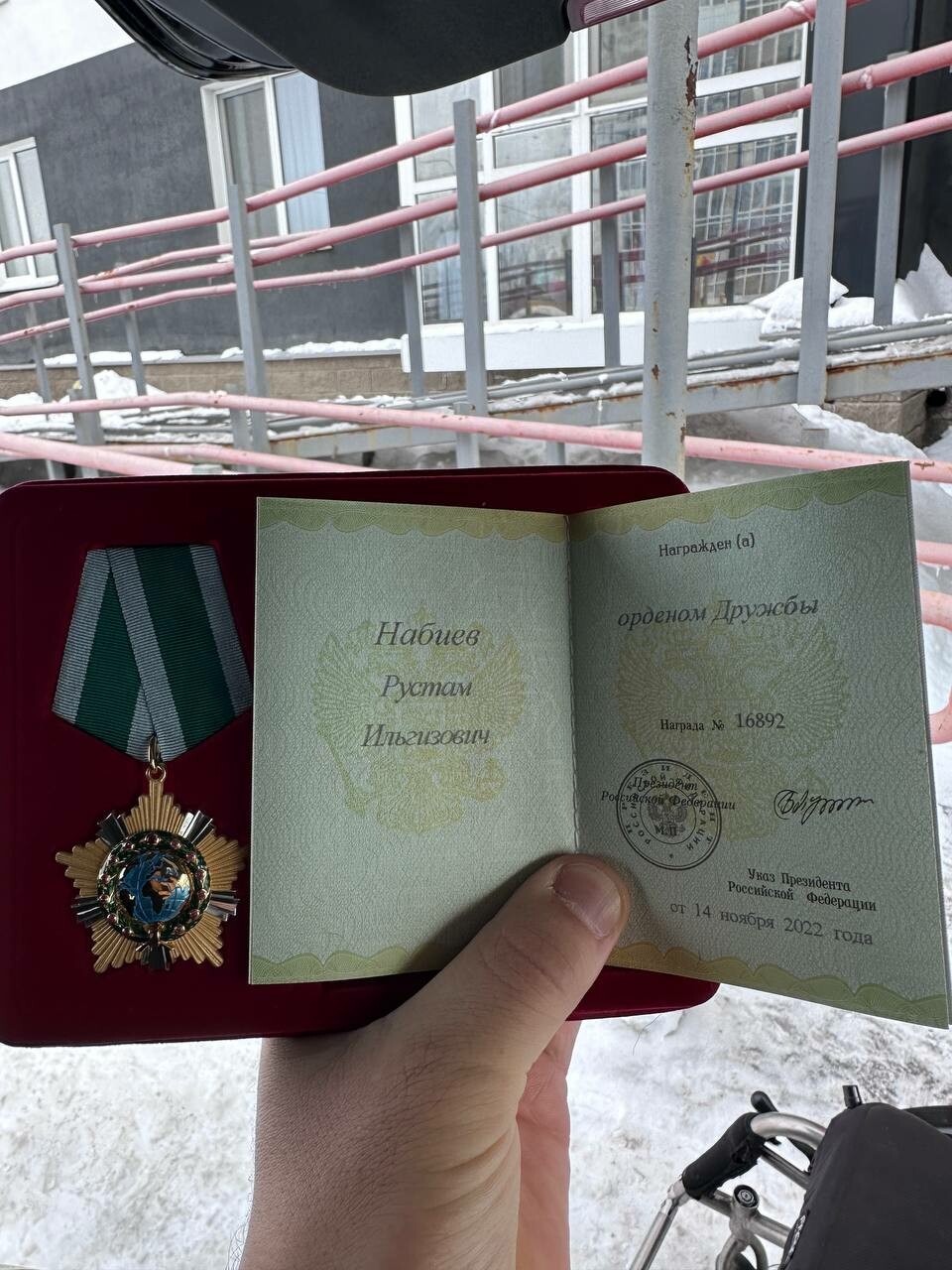 Блогер из Уфы Рустам Набиев, лишившийся обеих ног во время обрушения казармы в Омске, награжден орденом Дружбы. О получении награды от Президента России Владимира Путина он рассказал в своем телеграм-канале.