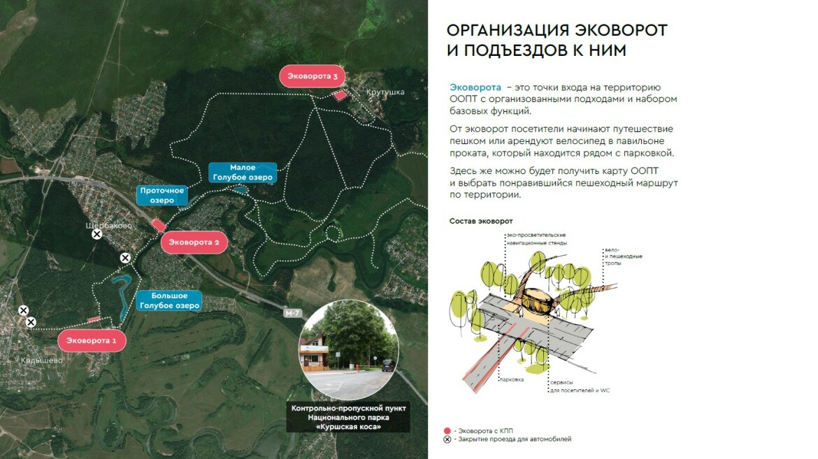 Что же планируется сделать на Голубых озерах? Во-первых, здесь создадут три зоны эковорот (входных групп). Они совместят в себе несколько функций: парковку, павильон с прокатом снаряжения для активного отдыха, контейнеры для мусора и датчики мониторинга количества посетителей, пункты охраны. Эковорота помогут регулированию туристического потока.