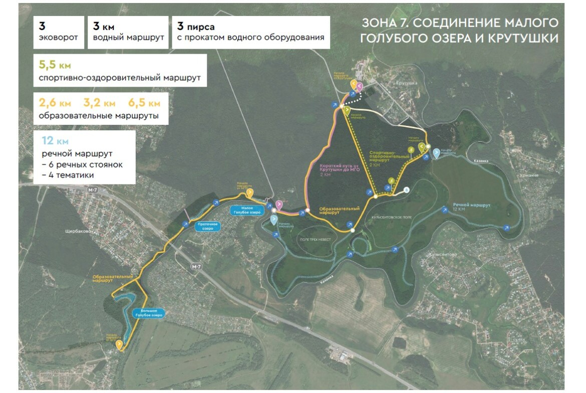 «Самым знаковым маршрутом, который свяжет Голубые озера с “Крутушкой”, будет речной маршрут. Это продолжение маршрута от Голубых озер до Волги, о котором я уже говорила. Будет запущено пять речных стоянок – это особые зоны отдыха у реки», – уточнила спикер.