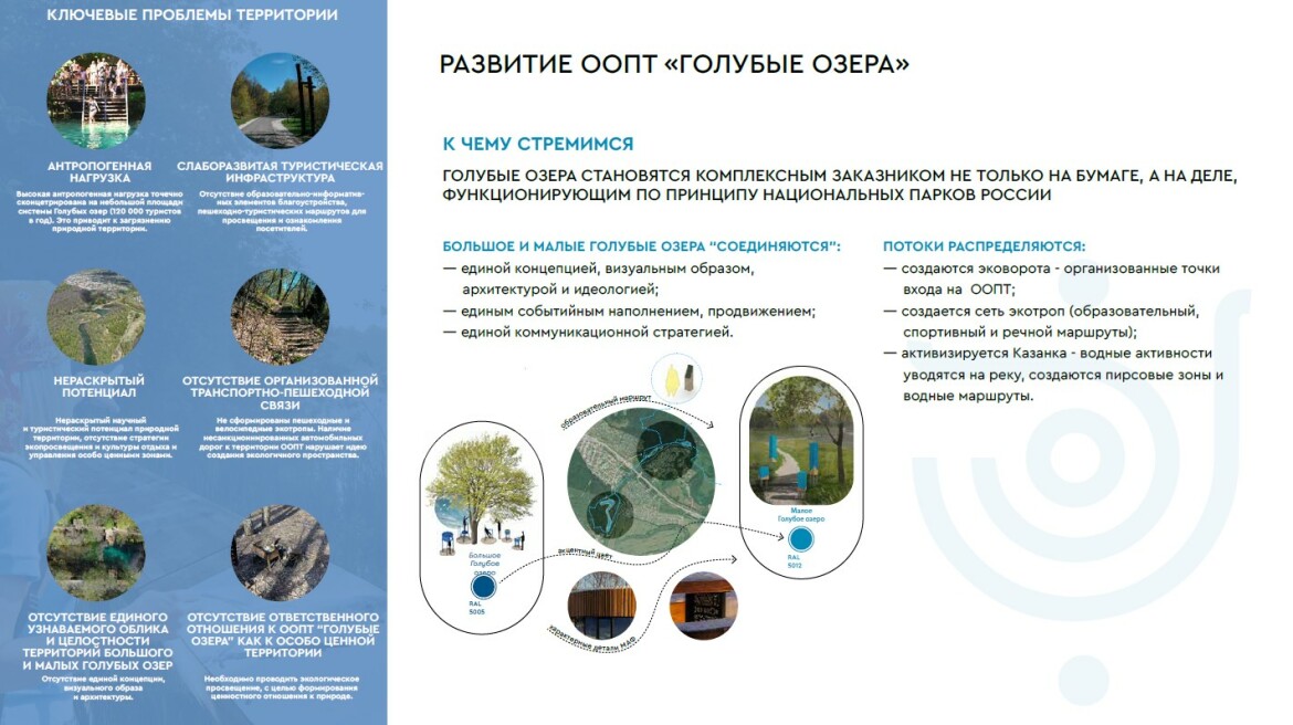 «Голубые озера должны стать комплексным заказником не только на бумаге, а на деле, по принципу функционирующих национальных парков. Мы хотим это сделать благодаря двум действиям. Во-первых, Большие и Малые Голубые озера должны объединиться за счет архитектуры, визуального образа, событийной программы. Во-вторых, потоки должны распределяться за счет эковорот, сети экотроп разного типа и вида и активизации Казанки», – поямнила Саргина.