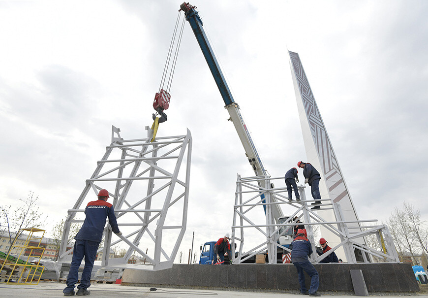 Рабочие завершают монтаж стелы «Казань — город трудовой доблести»