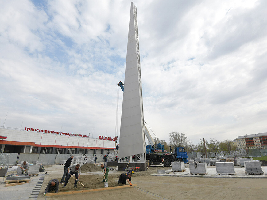 У Северного вокзала столицы Татарстана рабочие завершают монтаж стелы «Казань — город трудовой доблести», которая должна быть открыта в преддверии Дня Победы. Об этом сообщает пресс-служба мэрии.