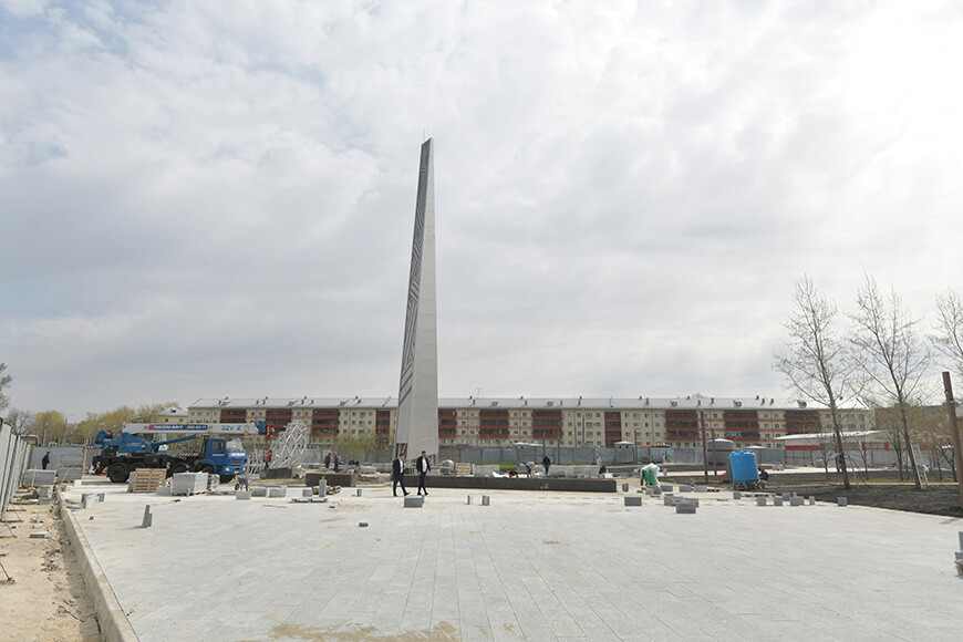 Параллельно организованы работы на территории, прилегающей к стеле. На 90% выполнено обустройство плодородного грунта и посевного газона. «Осталось завершить вертикальную планировку и положить брусчатку. На днях начнется монтаж второго пилона», — заключил Шайнуров.