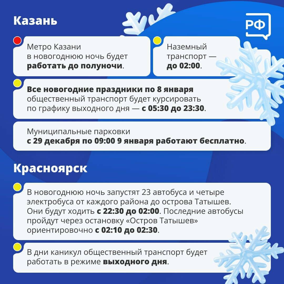 Так, 31 декабря метрополитен будет перевозить пассажиров до полуночи. Поймать наземный общественный транспорт можно до 2.00 1 января.