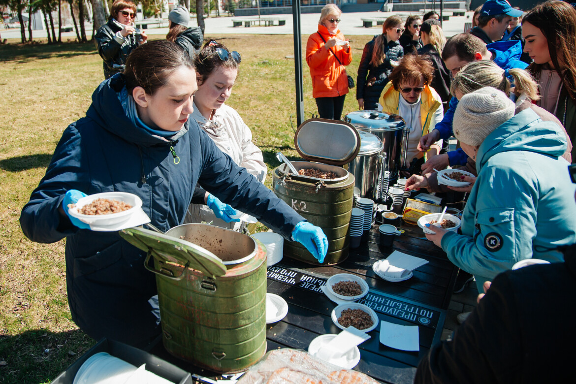 После уборки территории для участников организовали горячий обед из гречневой каши с тушенкой и чай.