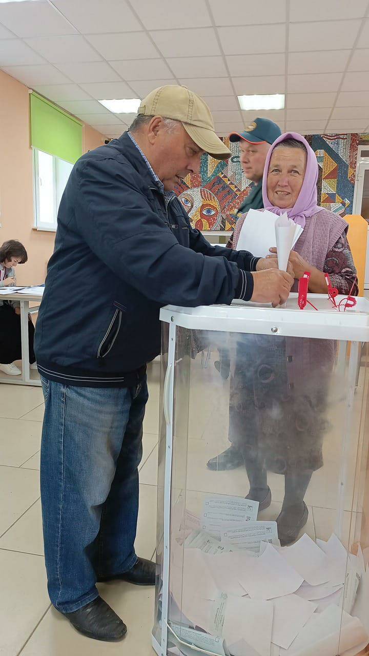 Проголосовали и родители участника СВО из Старого Каразерика Эльвира Карипова — Савия и Зайтун Кариповы. «Чтобы наши сыновья вернулись с победой и наступило мирное время, <...> пришли на выборы!» — сказали они.