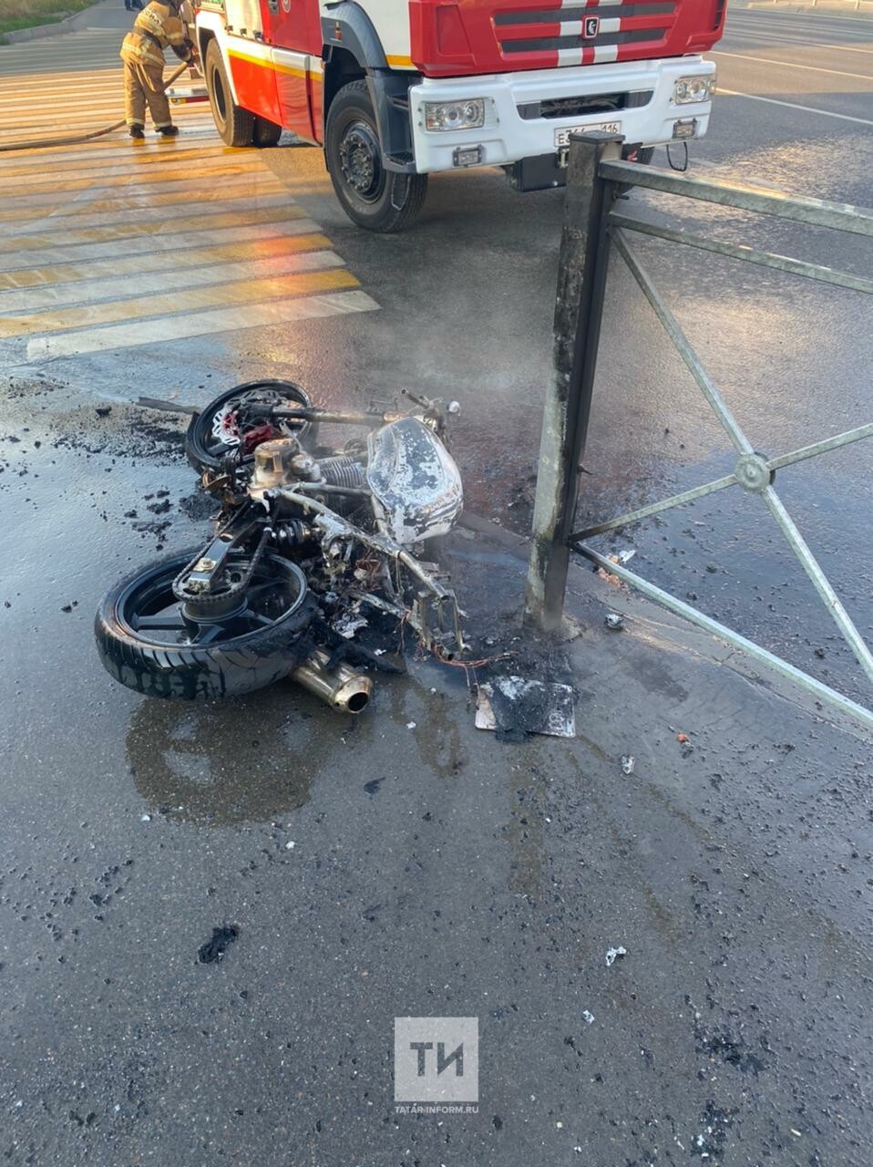 Рано утром в Казани байкер влетел в бордюр, после чего мотоцикл загорелся