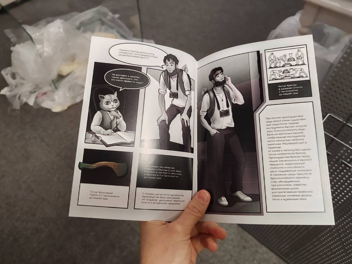 Выставочное пространство выстроено в форме черно-белого комикса. По сюжету с выставки пропадает подсвечник, и куратор вместе с музейным котом отправляется на его поиски.