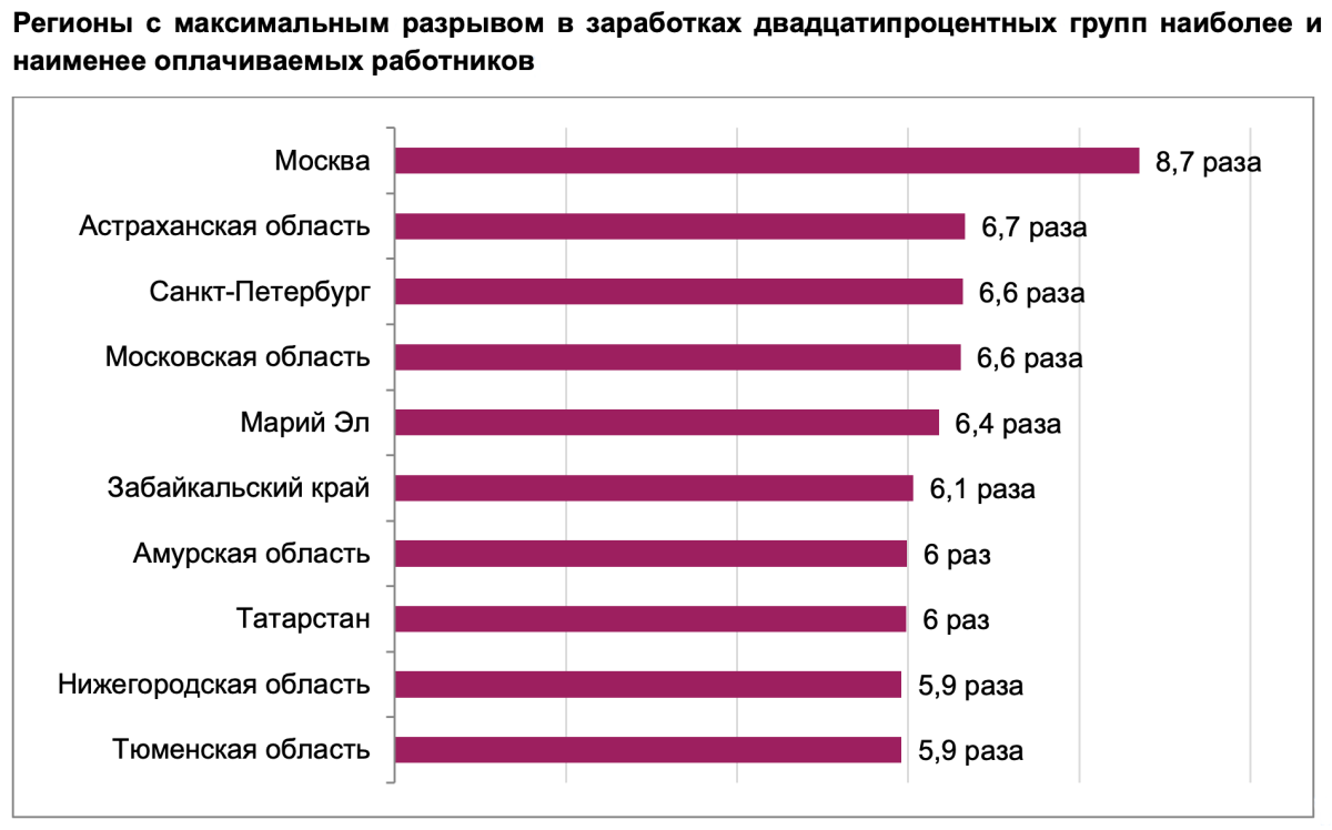 Неудивительно, что в Москве, где сосредоточена значительная доля высокооплачиваемых специалистов, разрыв между крайними долями составляет 8,7 раза. В остальных регионах разбросы колеблются от 6,7 (в Астраханской области) до 3,6 раза (в Республике Тыва).