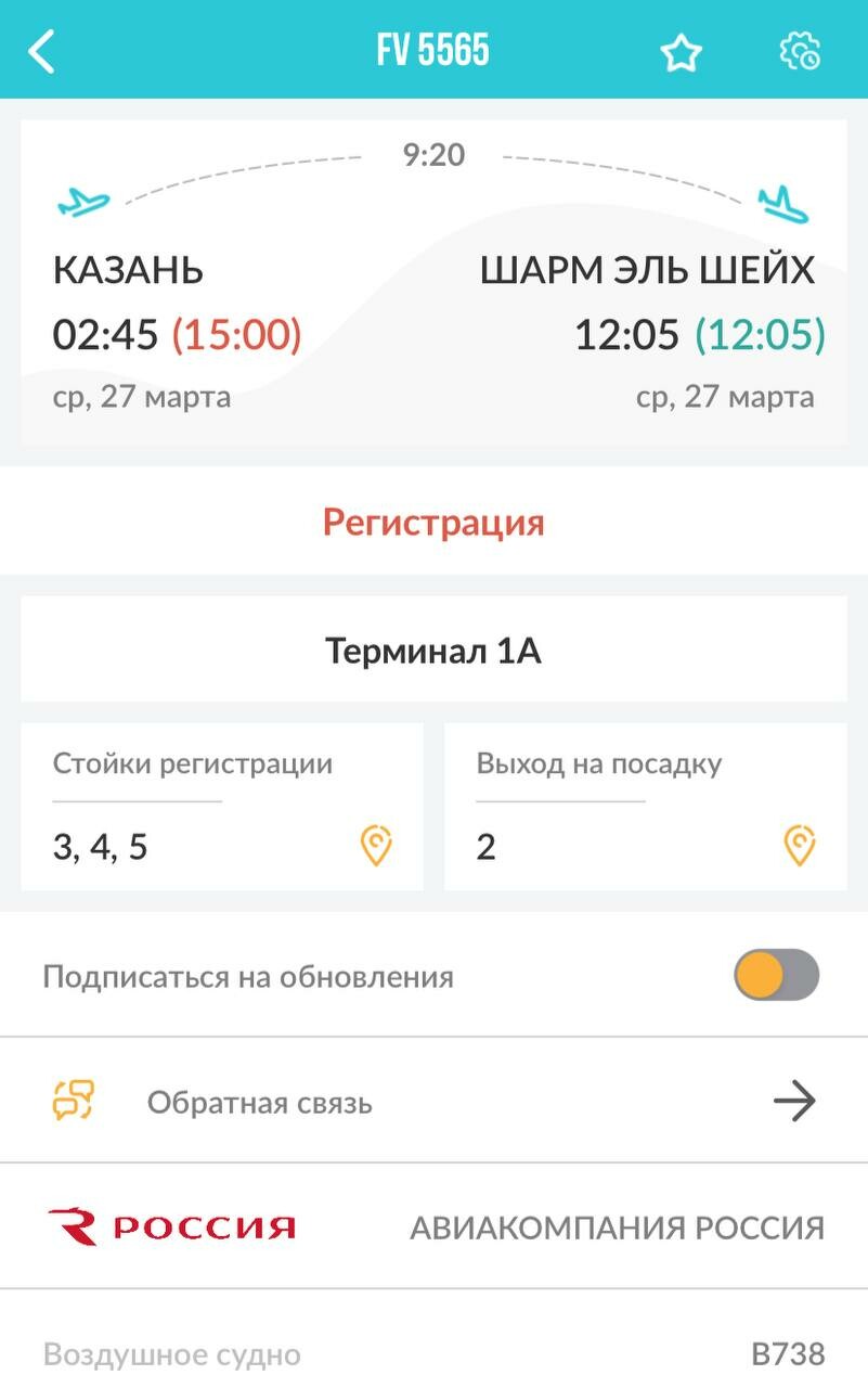 По данным онлайн-табло международного аэропорта «Казань», самолет рейса 5565 из Казани в египетский Шарм-Эль-Шейх задержали более чем на 12 часов. Самолет должен был вылететь еще в 2.45.