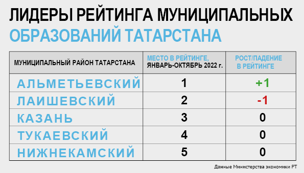Минэкономики Татарстана с некоторым опозданием, в начале декабря, но все-таки опубликовало очередной рейтинг социально-экономического развития муниципальных образований республики, на этот раз – за январь – октябрь 2022 года. Традиционно перемещения районов в сводной таблице сравниваются с итогами за предыдущий период (в данном случае – за январь – сентябрь текущего года), а также с рейтингом за весь 2021 год.