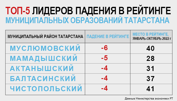 По четыре строчки потеряли аграрный Балтасинский (упал до 37-го места, с 2012 года им руководит Рамиль Нутфуллин) и Чистопольский (до 41-го, его глава с 2015 года – чемпион мира по армрестлингу Дмитрий Иванов) районы. И если для первого на самом деле глобально ничего не поменялось (район занимал это же место по итогам прошлого года), то второй в сравнении с результатами 2021 года ухудшил свое положение сразу на 14 позиций!