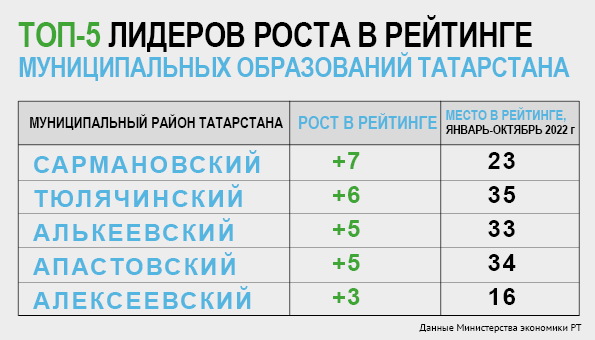 На шесть позиций поднялся и Тюлячинский район (с 2020 года его возглавляет бывший замглавы Минсельхоза РТ Назип Хазипов) – теперь он на 35-м месте. Еще два района – Алькеевский (с 2015 года им руководит Александр Никошин) и Апастовский (с 2021 года глава – Айрат Зиганшин) – переместились на пять позиций вверх, на 33-е и 34-е место соответственно. Это районы с преимущественно аграрным профилем экономики. Также стоит отметить перемещение на три позиции вверх, до 16-го места, Алексеевского района (им с 2018 года руководит Сергей Демидов).