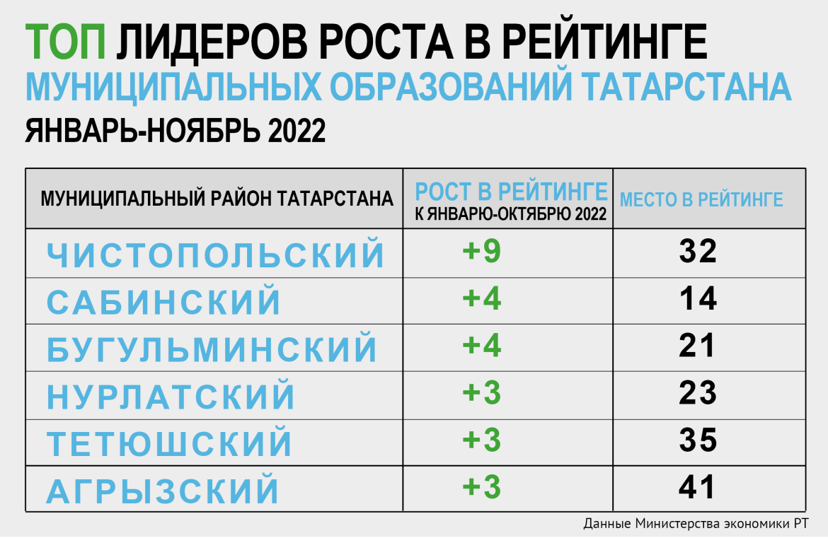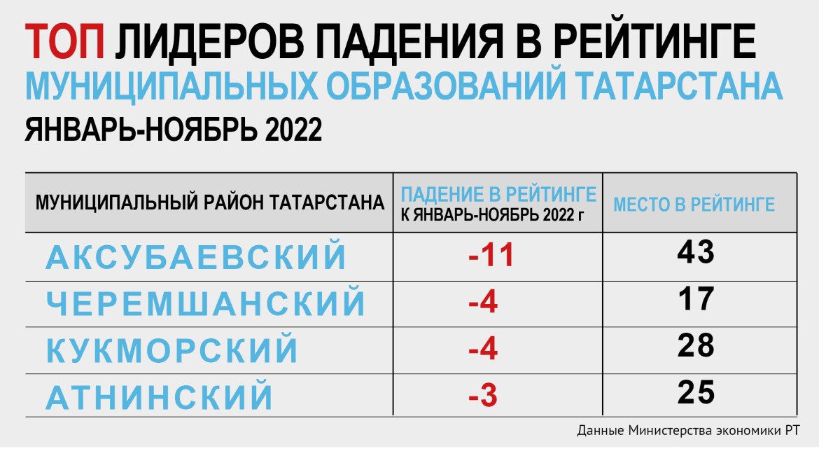 В завершение отметим, что в сравнении с показателями за январь – декабрь 2021 года, по данным на 11 месяцев 2022 года, сильнее всех упали Актанышский (на 19 строчек, с 12-го до 31-го места), Тетюшский (на 15, до 35-го), Дрожжановский (как уже было сказано выше, на 13, до последнего места), а также Мамадышский (с 16-го до 27-го), Буинский (с 18-го до 26-го) и Рыбно-Слободский (с 25-го до 38-го) районы.