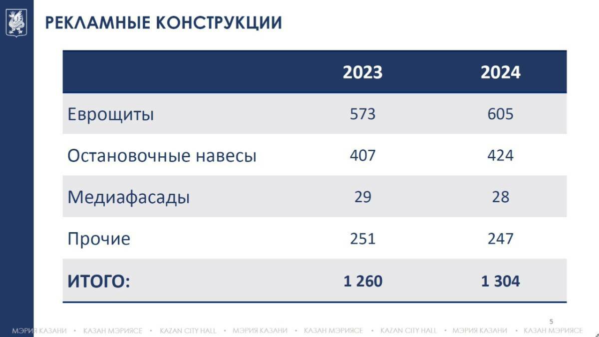 На данный момент в столице Татарстана действуют 1304 разрешения на установку и эксплуатацию рекламных конструкций. Основную долю занимают еврощиты, медиафасады и остановочные навесы. Развитие цифрового сегмента происходит в основном за счет замены статичных рекламных поверхностей на динамичные без увеличения общего количества конструкций. Это позволяет сделать городскую среду более современной и технологичной.