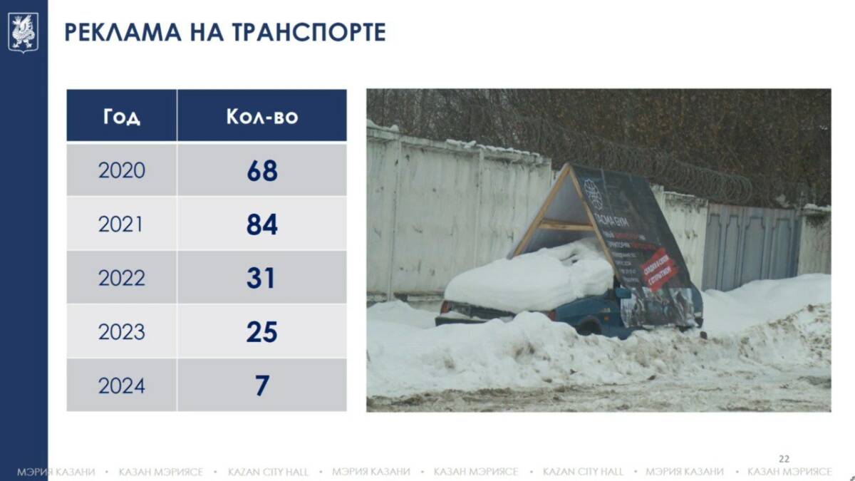 За последние четыре года в столице Татарстана удалось в десять раз уменьшить количество транспортных средств, используемых преимущественно в рекламных целях. В 2020 году было зафиксировано 68 таких случаев, а к концу 2024 года их число сократилось до семи, сообщил Аскар Багаутдинов.
