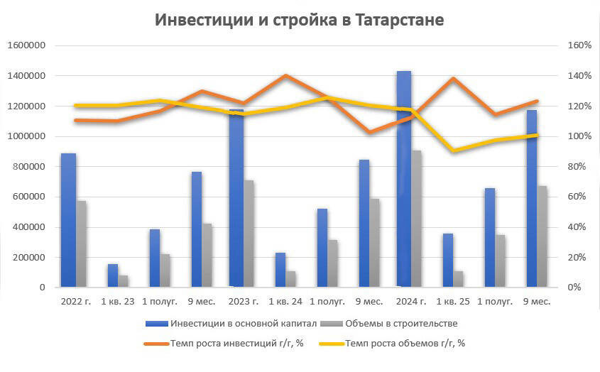 Столь резкий перекос в более «технологичные» инвестиционные ниши, какой случился вдруг в Татарстане, не получается переоценивать. С одной стороны, сдвиг коррелирует с ситуацией в строительстве. По итогам девяти месяцев 2025-го стройка в Татарстане по факту стагнирует – не считать же ростом, даже с учетом высокой базы, темп в 1%. Но это в целом по сектору. А по крупным и средним организациям объемы работ рухнули более чем на четверть. Ввод жилых домов вырос всего на 2,4%, при этом в сегменте ИЖС просадка превысила 25%.