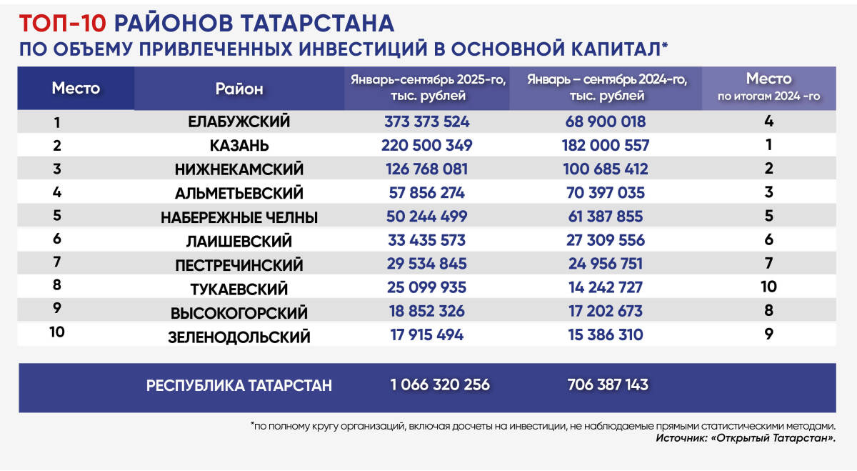 Тут стоит оговориться, что доли в отраслевом разрезе Татарстанстат высчитывает от объемов инвестиций, из которых исключены субъекты МСП и так называемые вложения, «не наблюдаемые прямыми статистическими методами» (926 млрд рублей за январь – сентябрь 2025-го, годом ранее – более 601 млрд). А в географическом – от объемов за вычетом только бюджетных средств (более 1 трлн рублей, в прошлом году за те же девять месяцев – 706,3 млрд).