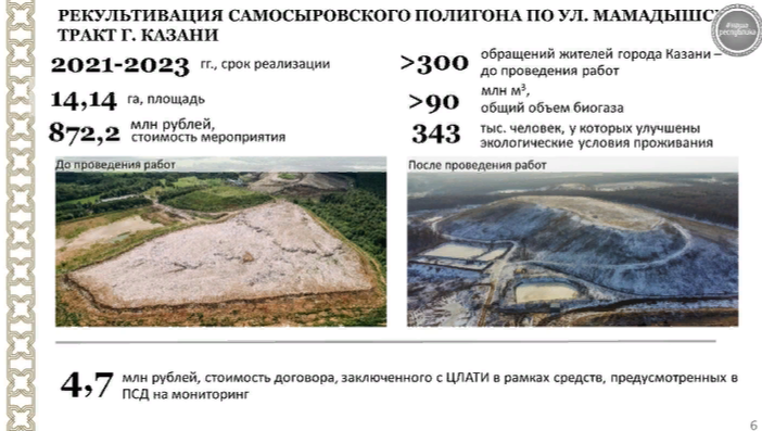 «В этом году благодаря федеральному проекту „Чистая страна“ нацпроекта „Экология“ ликвидирован еще один объект негативного воздействия на карте Татарстана — это Самосыровский полигон. Еще с 2020 года мы обсуждали эту проблемную точку, тогда мы получили около 300 жалоб от жителей на качество атмосферного воздуха. Наконец-то объект был сдан в этом году», — рассказал министр.