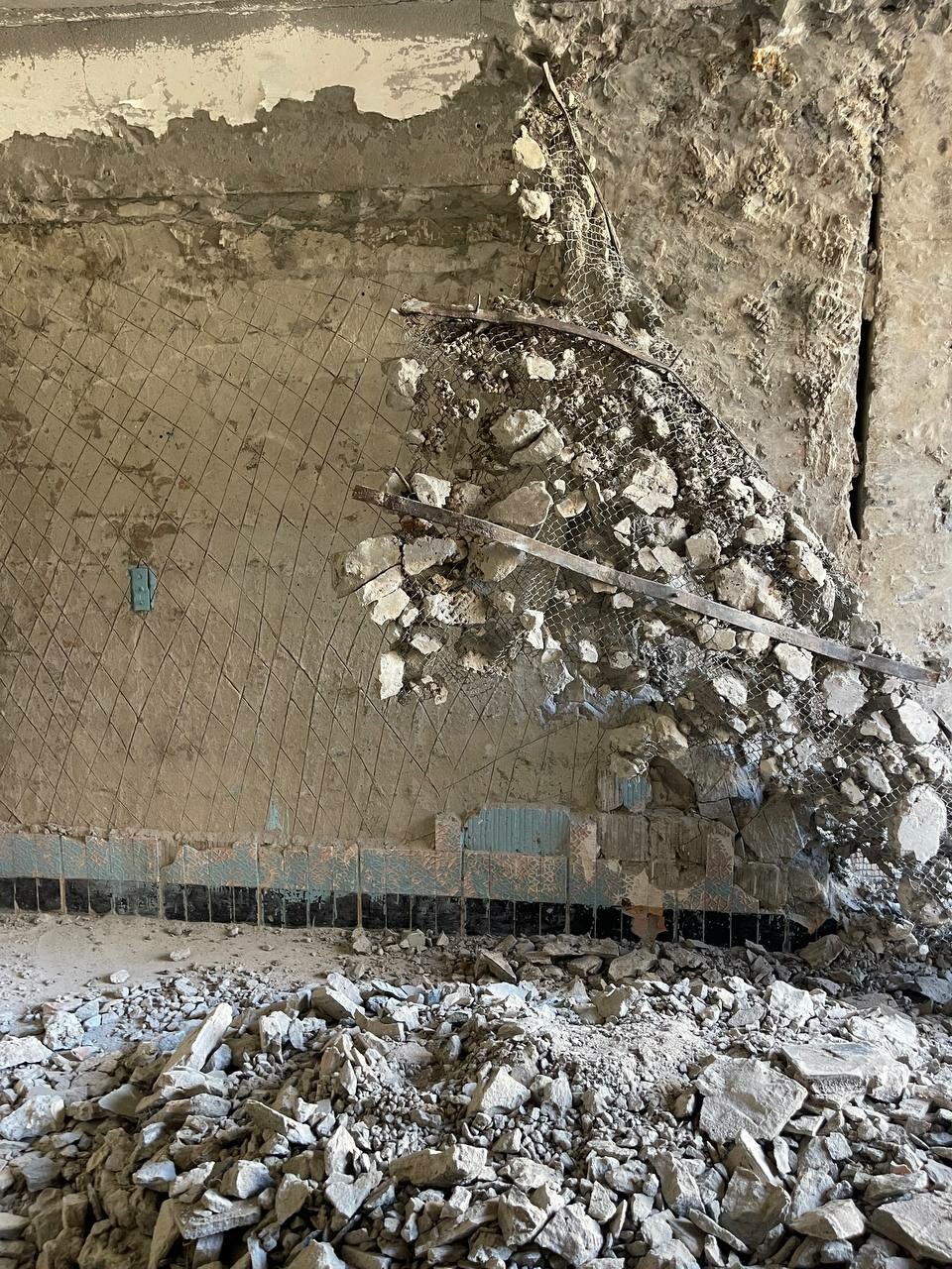 Сейчас рабочие отбивают от стен и колонн старую облицовку, проведен демонтаж некоторых участков.