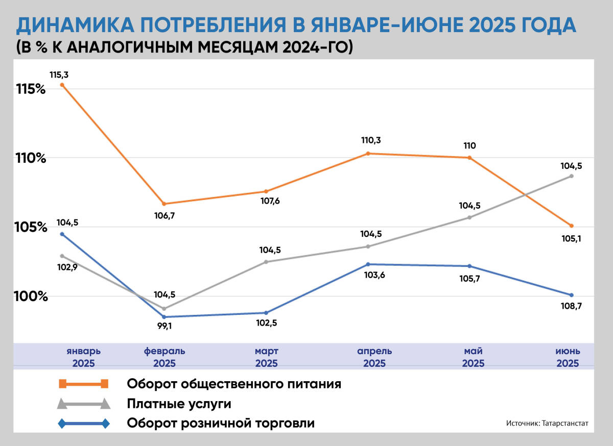 Суммарный оборот розницы, общепита и платных услуг населению в Татарстане за январь – июнь 2025-го превысил 1,1 трлн рублей. Но темпы роста потребительского рынка за первую половину года существенно замедлились. Чего ждать во втором полугодии – в обзоре «Татар-информа».