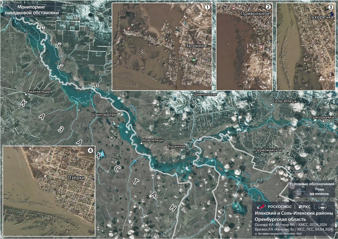 Роскосмос показал, как со спутников происходит мониторинг паводков в Оренбургской области и других регионах. Снимки опубликованы в телеграм-канале госкорпорации.