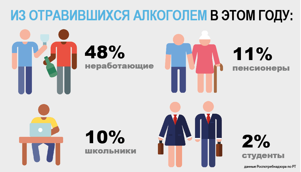Чуть менее половины из всех отравившихся – 48% – неработающие, более 11% – пенсионеры, порядка 2% – студенты. И 10% из всех отравившихся, по данным Роспотребнадзора Татарстана, школьники.