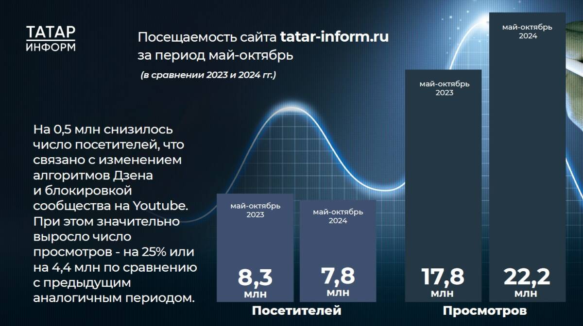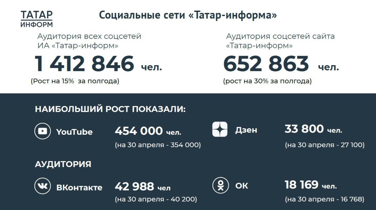В целом аудитория соцсетей сайта «Татар-информ» составила 653 тыс. подписчиков, а всех соцсетей информагентства – 1,4 млн.