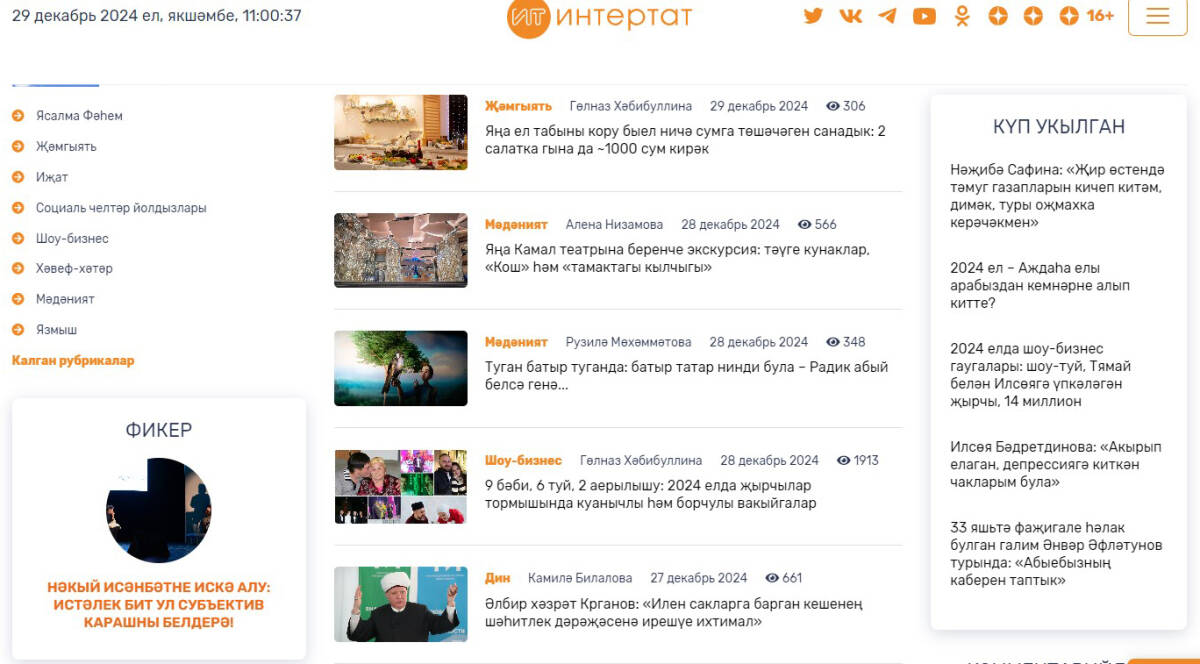 Татарская редакция «Татар-информа» активно развивала свои социальные сети. По сравнению с прошлым годом число подписчиков «Интертата» на разных ресурсах выросло на 90 процентов — до 755 тысяч, в том числе до 200 с лишним тысяч на Ютьюбе (год назад – 174 тысячи). В редакции начали активно пользоваться возможностями искусственного интеллекта, в том числе для быстрого изучения больших объемов материалов и даже написания стихов на татарском языке. Появился в стенах редакции и первый татарский нейрожурналист – Яхья Фагимов.