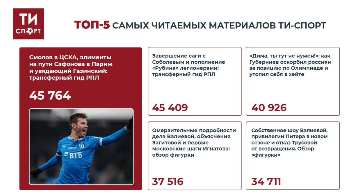 Если сравнивать топ материалов с прошлогодним, то заметно угасание интереса читателей к событиям вокруг фигурного катания. Наверное, это закономерно: сага с дисквалификацией уроженки Казани Камилы Валиевой осталась в прошлом (впрочем, всколыхнувшись в конце года), а непрерывно возникающие инфоповоды о светской жизни экс-фигуристок успели всех утомить. «Трафик тащили» старые добрые футбол и хоккей.