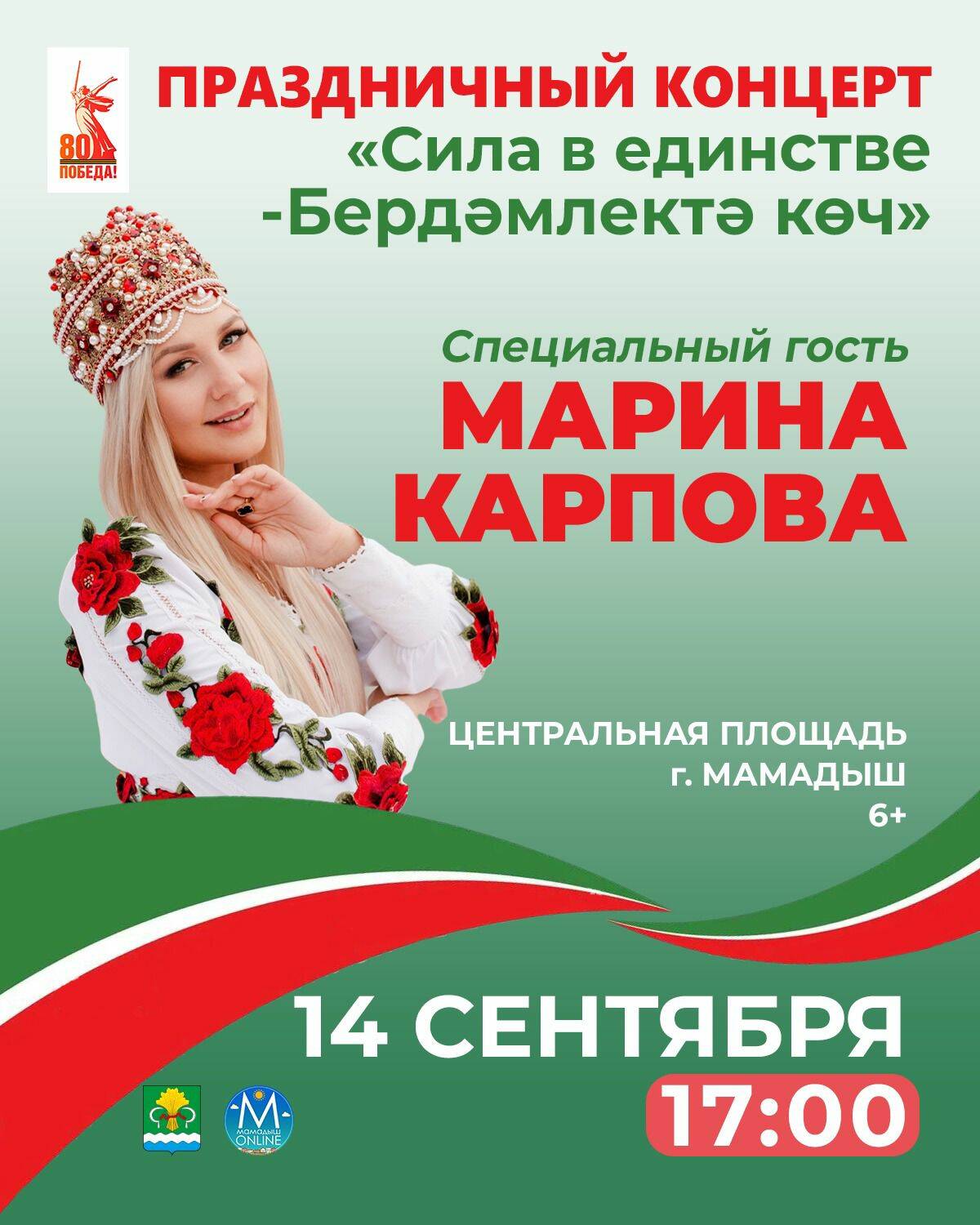 14 сентября в Мамадыше день выборов обещает стать настоящим праздником. В этот день на центральной площади пройдет большой концерт «Сила в единстве – Бердәмлектә көч» с участием специального гостя Марины Карповой. Начало – в 17 часов.