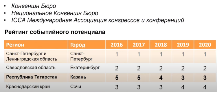 «Мы начали здесь активную работу. Есть рейтинг событийного потенциала, и мы занимали в нем пятое место. С тех пор как мы создали „Конвеншн бюро“ и начали активно работать, нам удалось выйти на четвертое место в 2018 году, в 2019 и 2020 годах РТ удерживала третью позицию. Сейчас у нас есть амбиции для того, чтобы занять второе место в этом рейтинге», — отметила она.