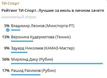 По итогам первого дня голосования в рамках первого этапа Спортрейтинга Татарстана в личном зачете лидирует албанский форвард «Рубина» Мирлинд Даку с результатом в 56% голосов, на втором месте наставник казанского клуба Рашид Рахимов (17%). Тройку лучших замыкает казанская теннисистка Вероника Кудерметова (13%).
