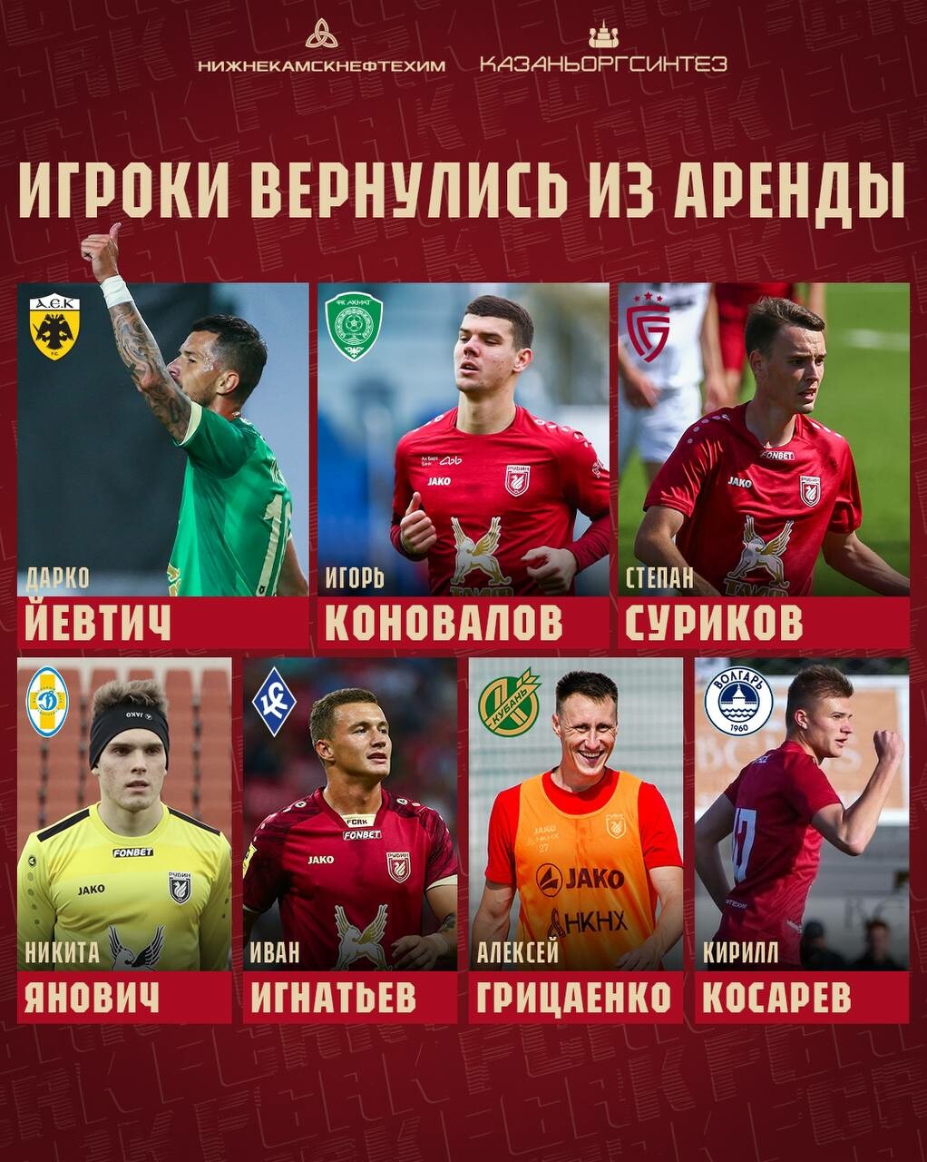 Так, в Казань после выступлений в арендах вернулись: голкипер Никита Янович, защитники Степан Суриков и Алексей Грицаенко, полузащитники Игорь Коновалов и Дарко Йевтич, а также нападающие Иван Игнатьев и Кирилл Косарев.