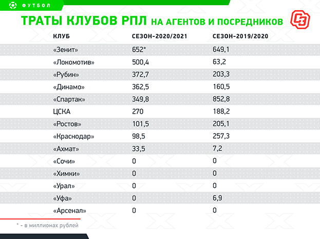 Самым щедрым на вознаграждения для агентов и посредников при заключении трансферов стал «Зенит», который выплатил на эти цели 652 млн рублей. Второе место у «Локомотива» – 500 млн рублей.