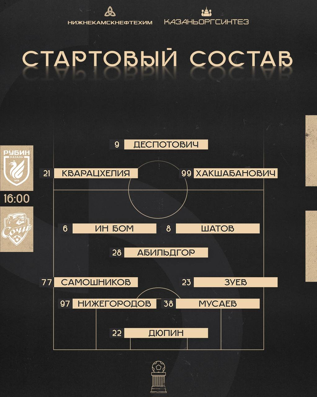 «Рубин»: Дюпин, Самошников (Савицкий, 70), Нижегородов (Суриков, 46), Мусаев, Зуев (Зотов, 61), Абильдгор (Сайто, 61), Хван (Костюков, 46), Шатов (Бакаев, 46), Кварацхелия (Макаров, 61), Хакшабанович, Деспотович (к) (Игнатьев И., 46).