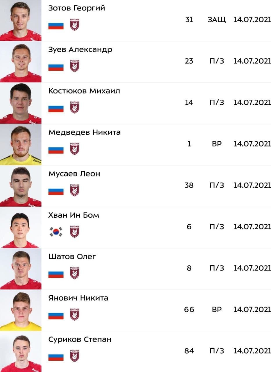 В заявку внесены вратари Никита Медведев и Никита Янович, защитники Георгий Зотов и Александр Зуев, а также полузащитники: Михаил Костюков, Леон Мусаев, Ин Бом Хван, Олег Шатов и Степан Суриков.