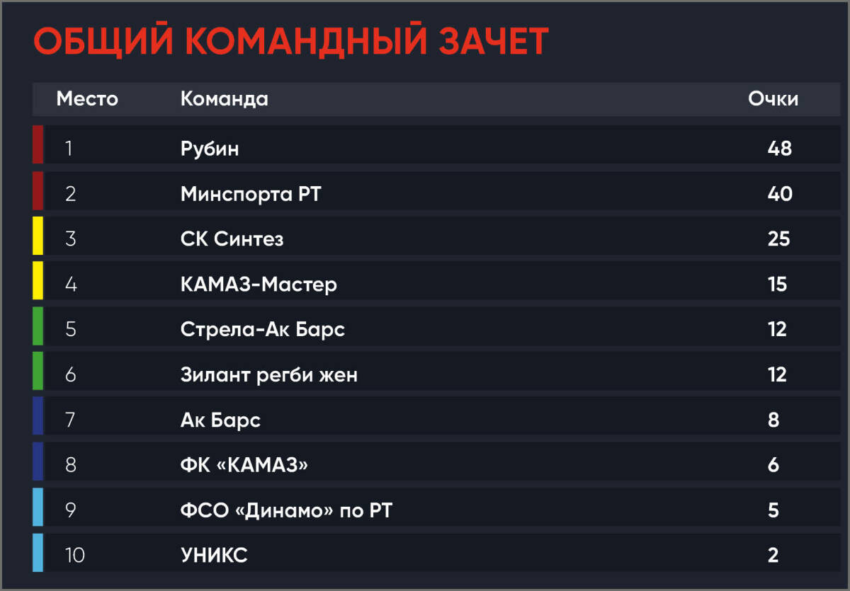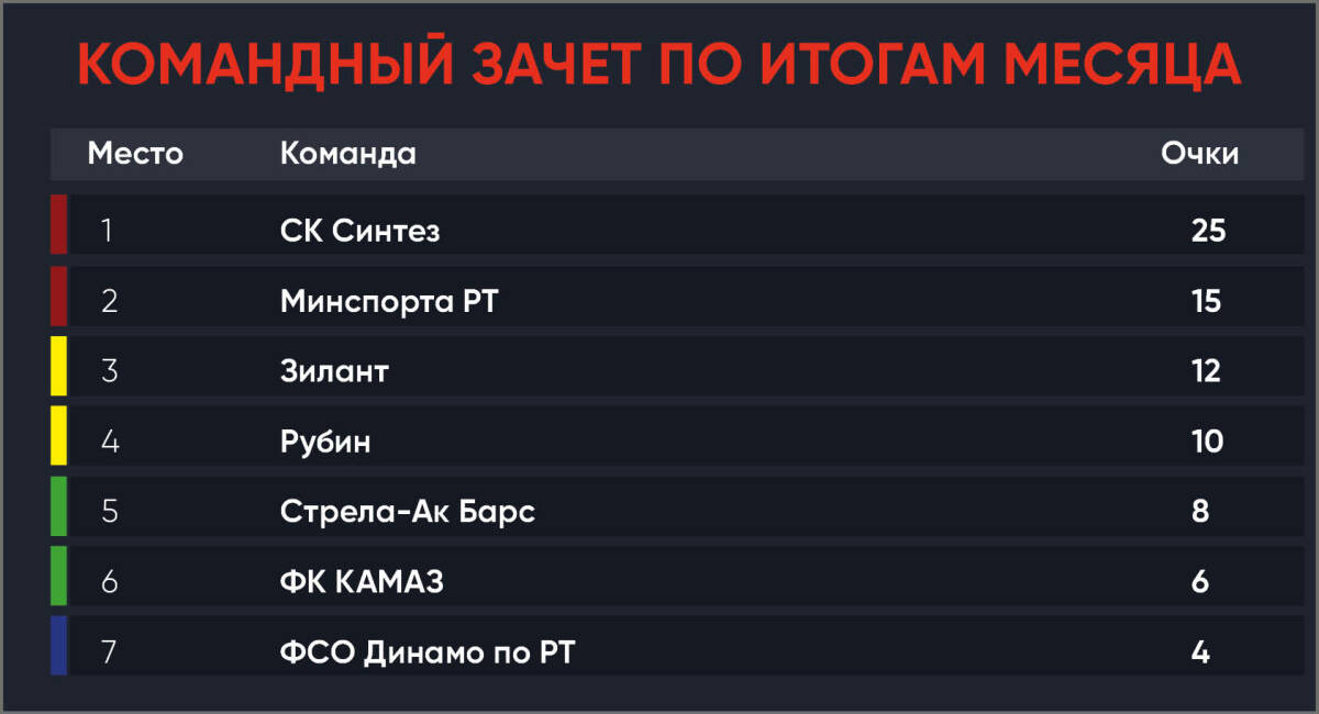 В командном зачете по итогам 2 этапов лидирует «Рубин», которому 10 очков за победу в голосовании позволило обойти в таблице Минспорта РТ (2 место). Тройку лучших замыкает СК «Синтез».