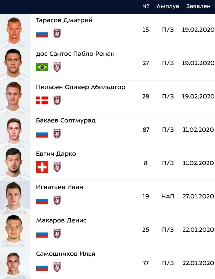 Ими стали датский полузащитник Оливер Абильдгор, который заявлен под номером 28, бразильский защитник Пабло Сантос (номер 27) и бывший игрок «Локомотива» Дмитрий Тарасов, который будет играть в «Рубине» под 15-м номером.